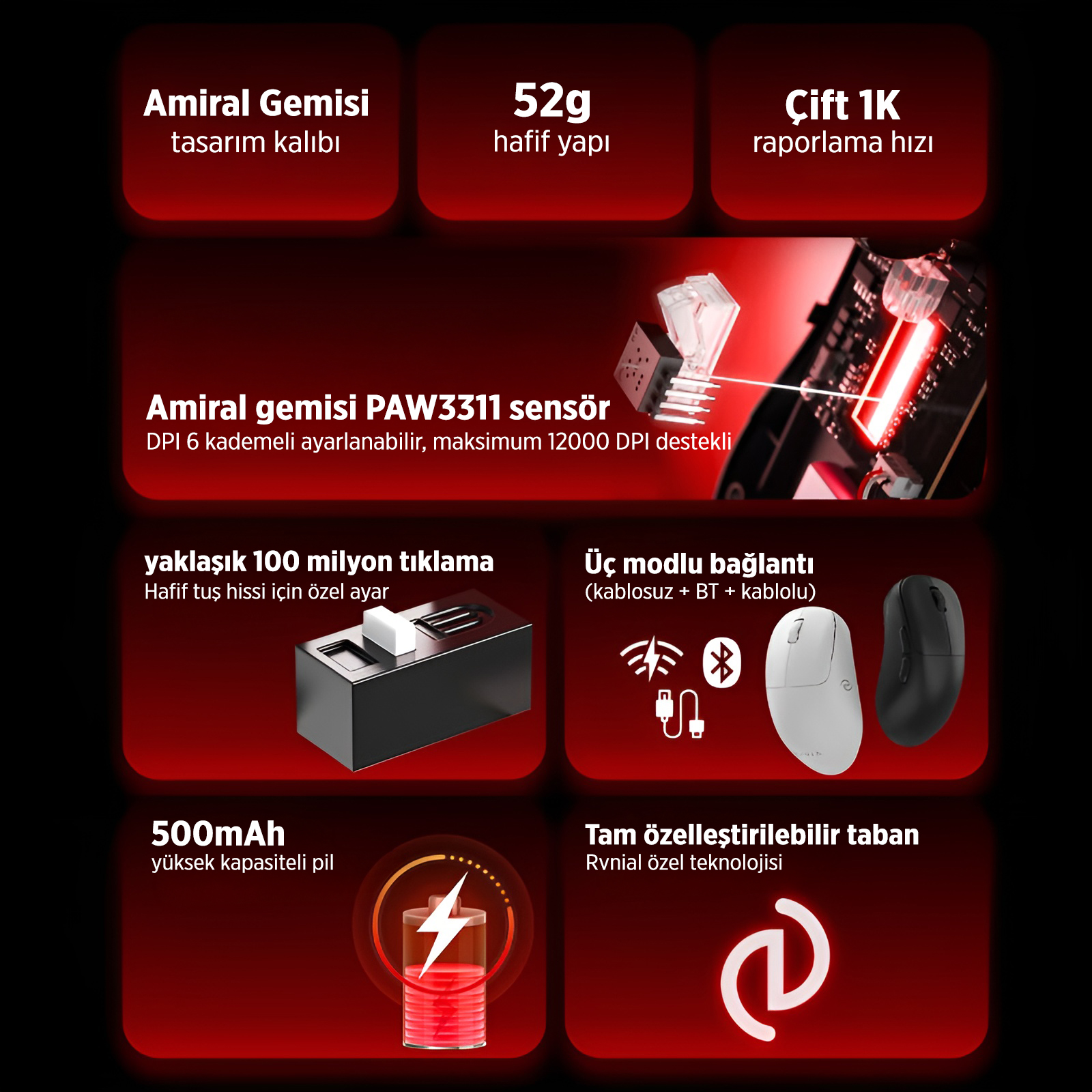 - DPI Hassasiyeti: 800-1200-1600-3200-5000-12000 DPI